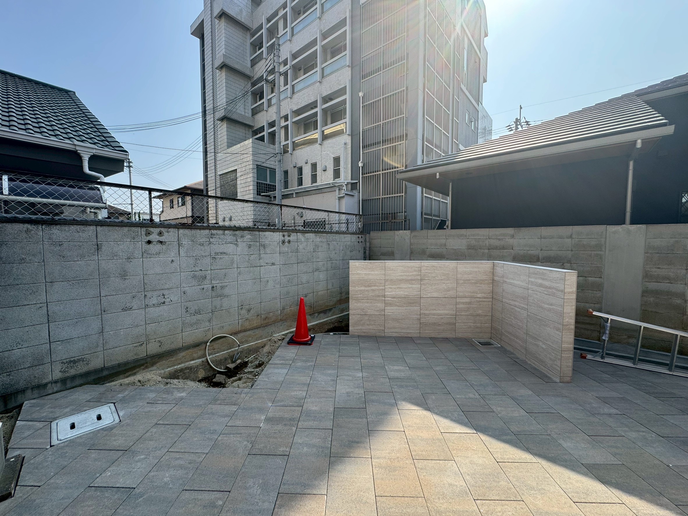 お店までのアプローチが少しあり、外壁と同じタイルの壁にサインが施工されてます。