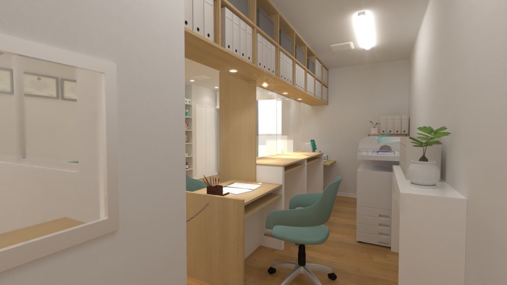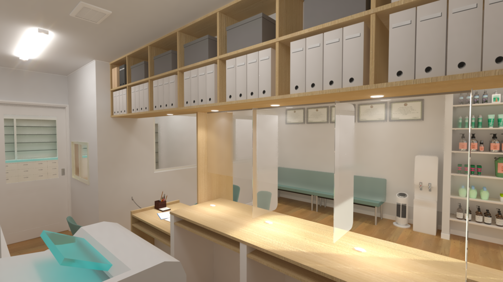 現在計画中の薬局内装について、受付まわりの仕様を一部見直しました。