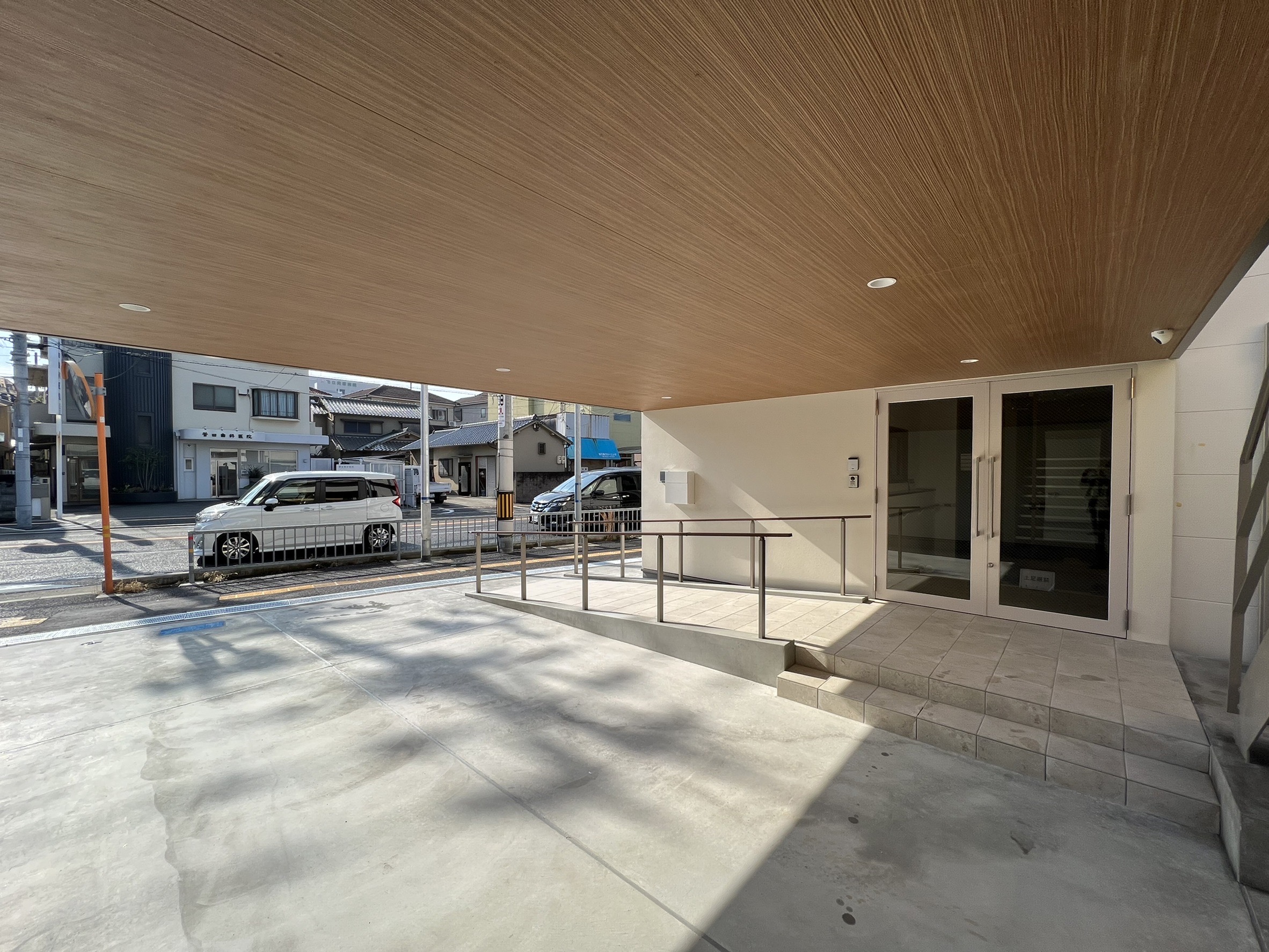 玄関のスロープの先にある鉄骨階段が透けて見えています。