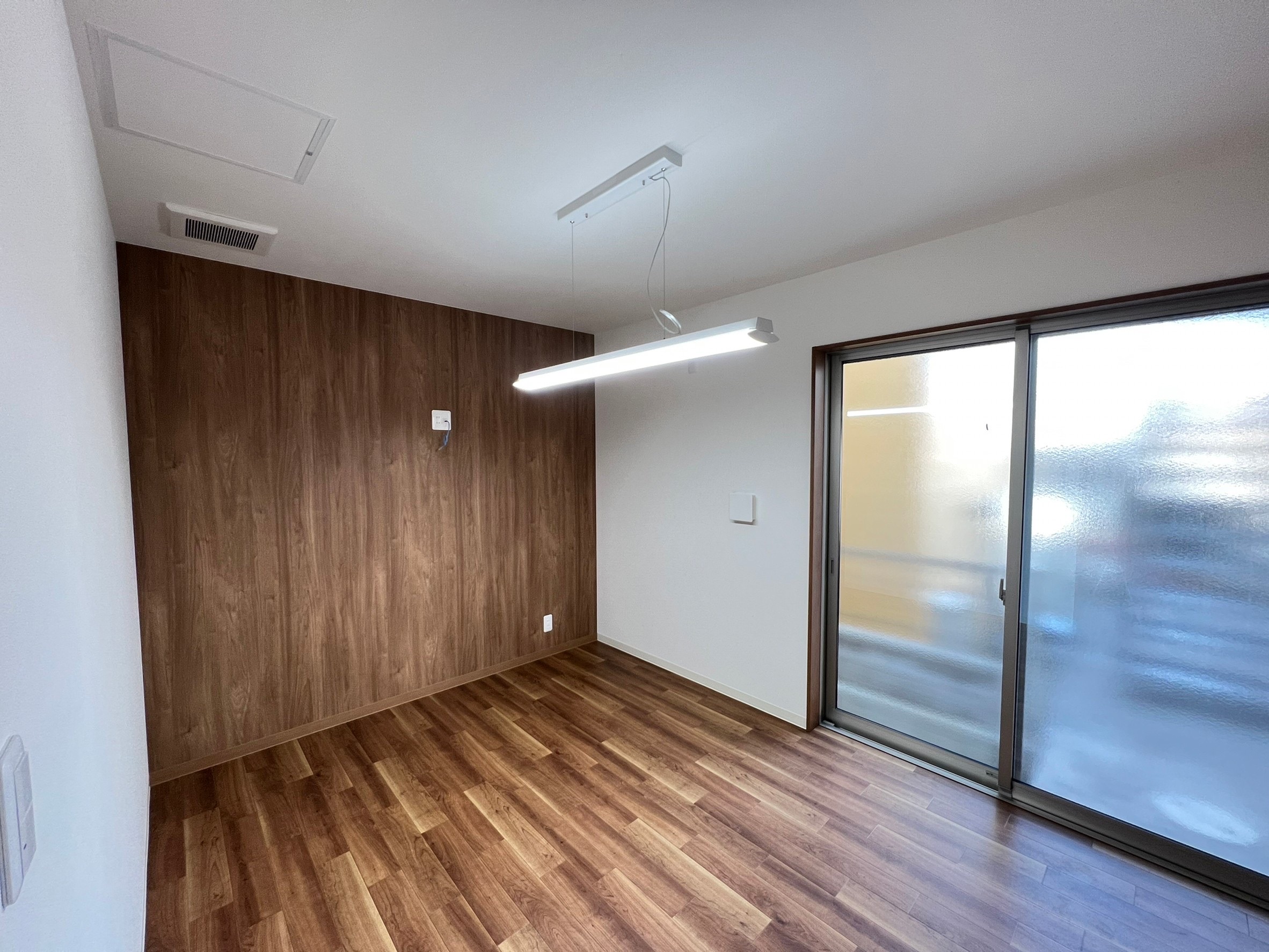 向きを変えて、部屋を見渡した先には、木目のアクセントウォール。