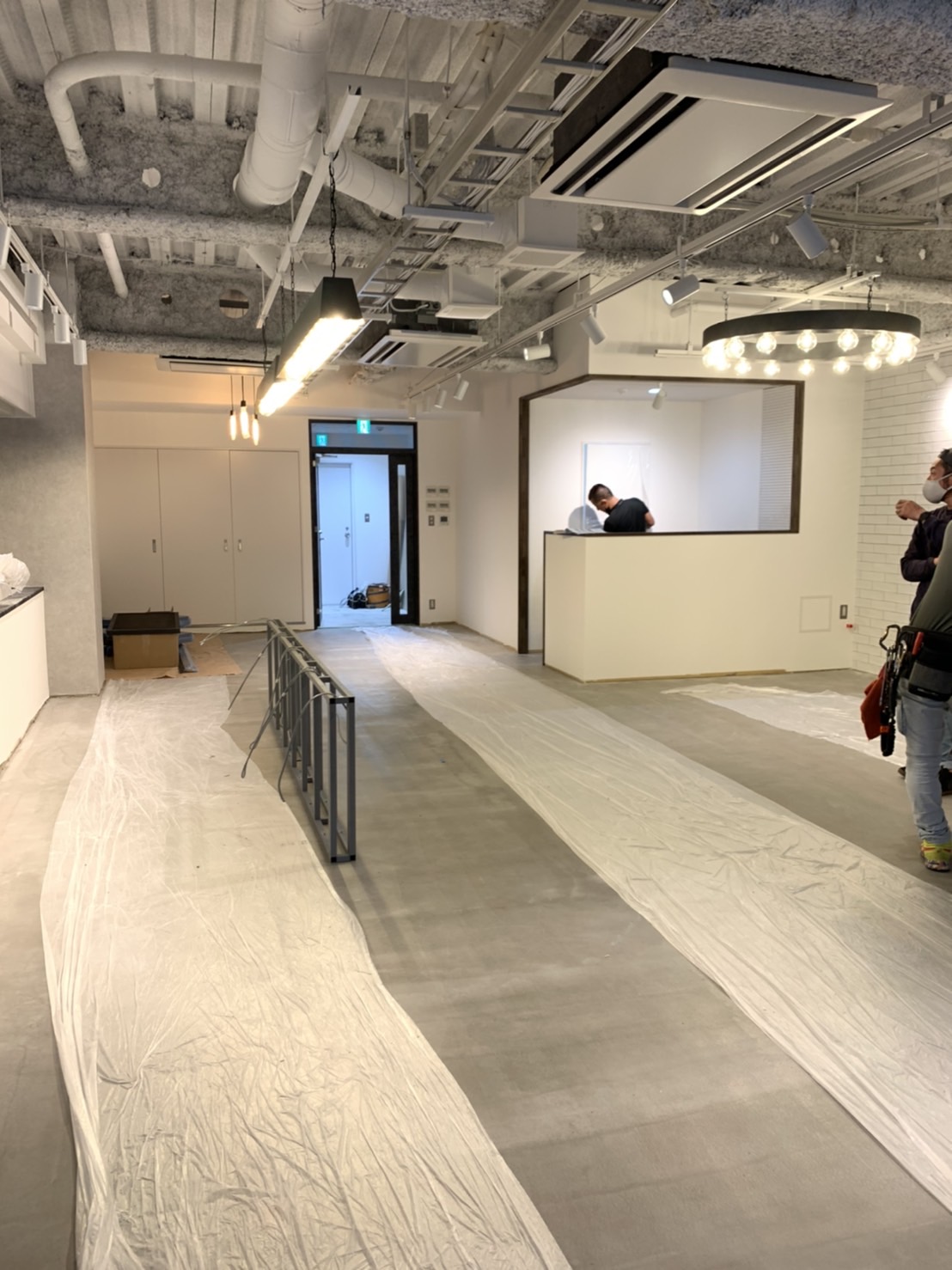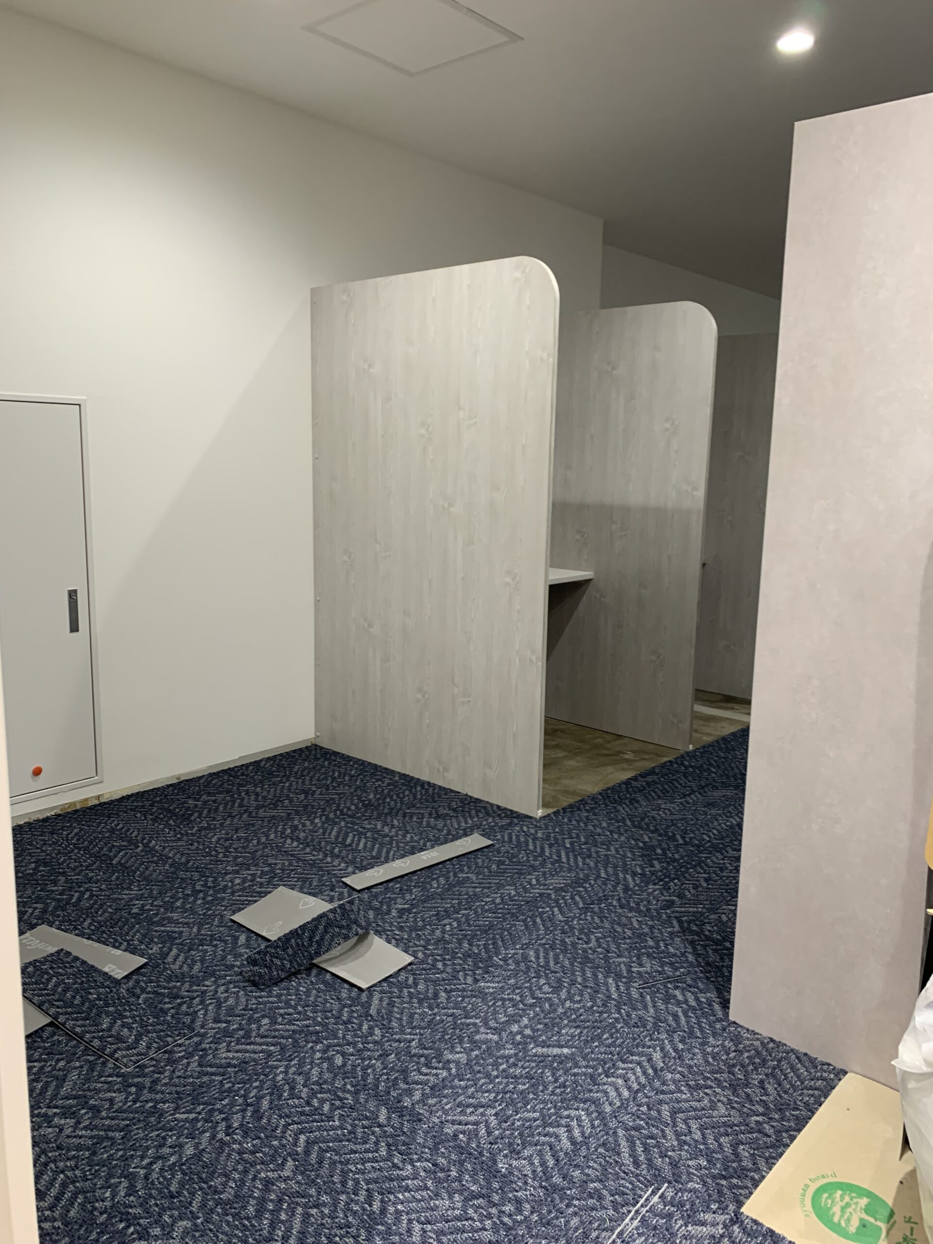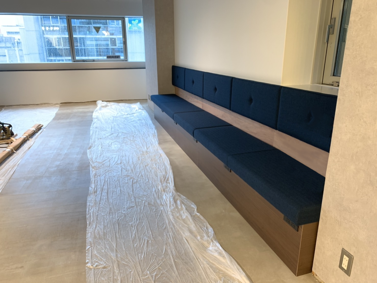 更に、9階のベンチソファと同じカラーのタイルカーペットが敷き込まれている途中でした!
