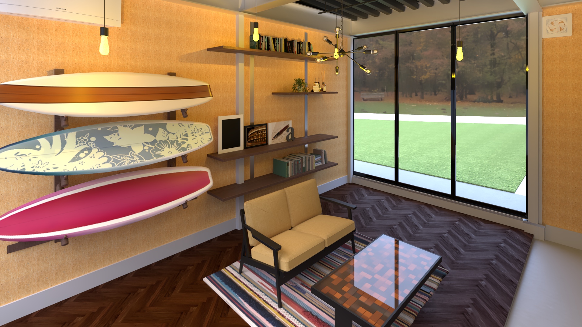 さて、こちらは壁の仕上げにOSBを使用したアメリカンビンテージ。ウォルナット系のヘリンボーンの床と、スプートニクの照明で、遊び心あるインテリア。