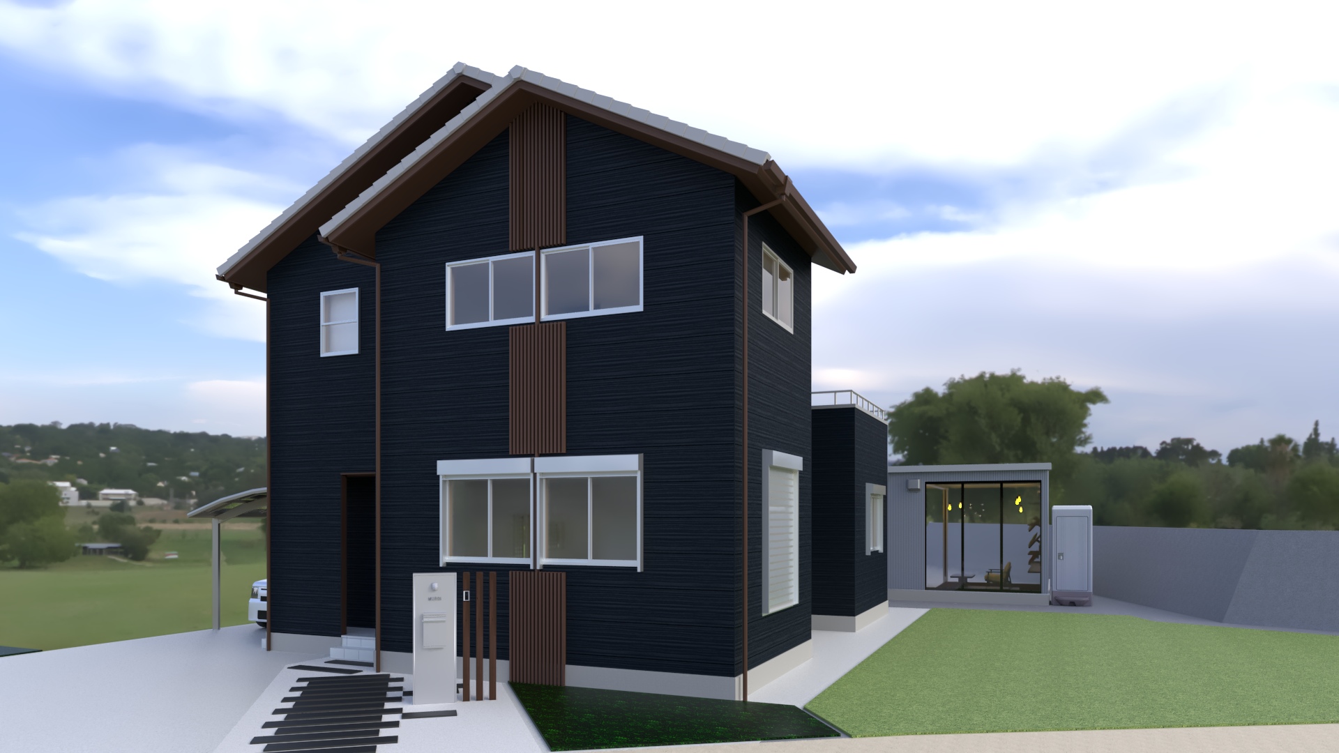 お住まいの方の外壁は、お客様のご希望でネイビー×ブラウン。そのご要望を踏まえた外観イメージと、ガレージを合わせて見てみましょう。