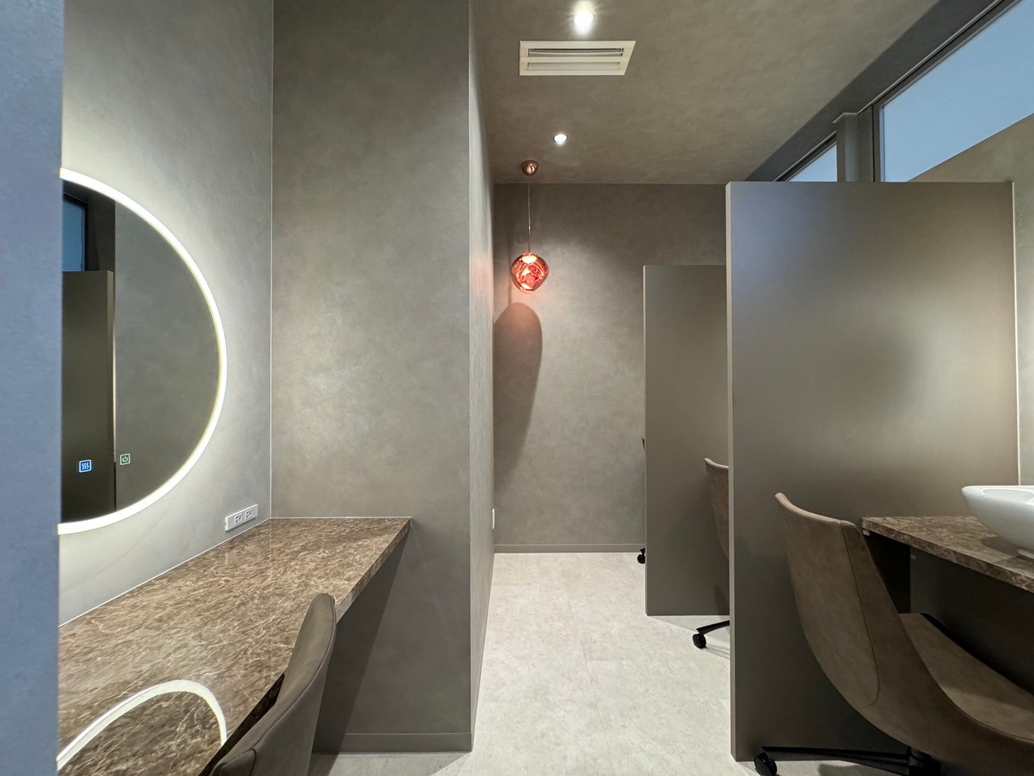 1ブースごとに間仕切りを設け大きな照明付きのミラーを計画し、