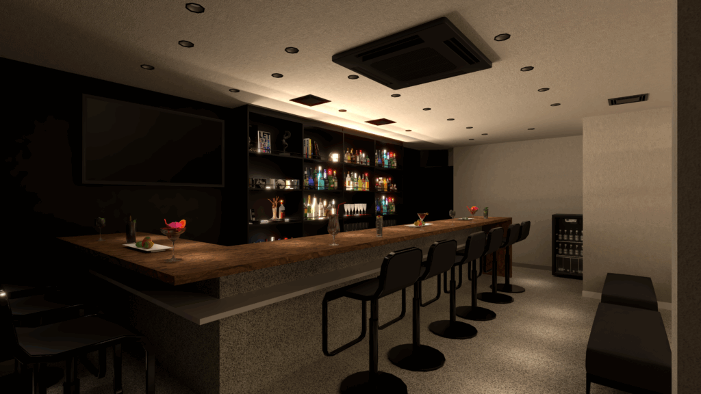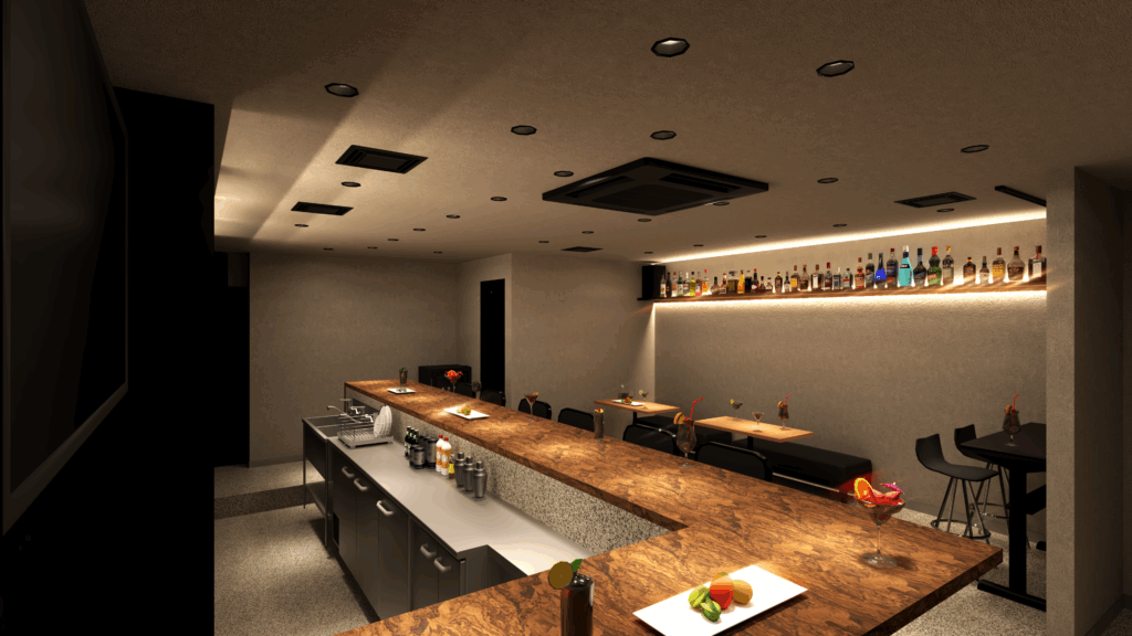 バーカウンター背面の棚には間接照明を仕込み、ボトルを柔らかく照らし出す演出がポイントです。