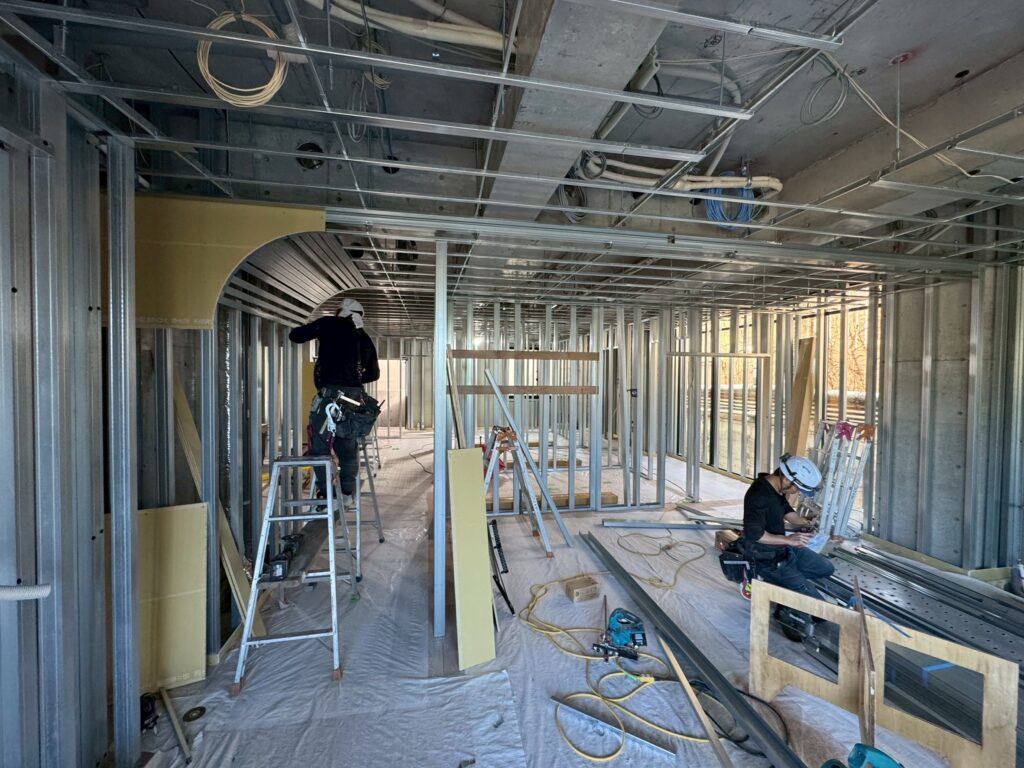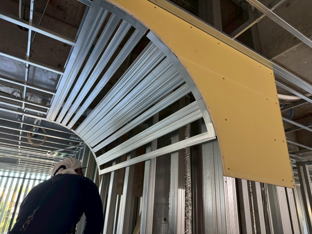 軽鉄(LGS)を使用した天井から壁へと続くアーチ形状の施工を行っています。