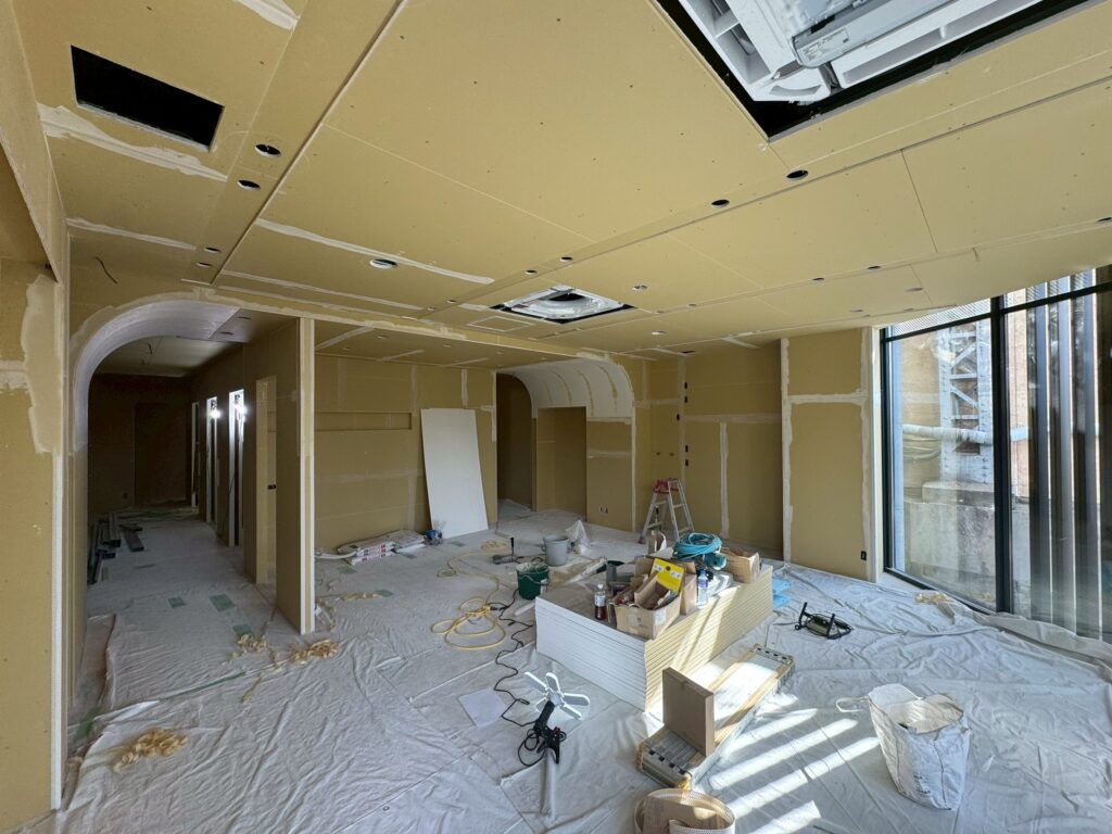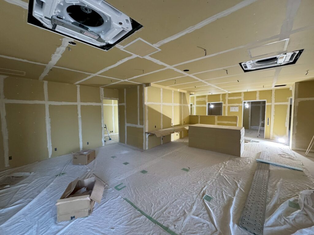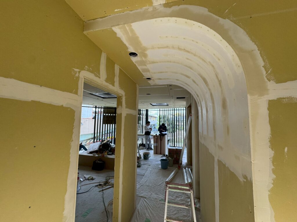 先日まで行っていたボード貼りとパテ処理が完了し、いよいよ仕上げ工程に入ります。